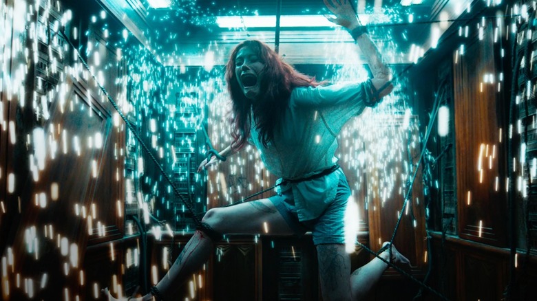 This movie also uniquely introduced the Necronomican and how the voices are then heard to induce the demon filled fun. Through the airwaves of a record player that releases the madness onto Ellie (Alyssa Sutherland) in an elevator being restrained by many wires and cables for a brutal possession scene. At least they got away from the tree rape type possession like we got in Evil Dead 2013. Nonetheless the immediate toll the possession has on Ellie takes the film to it’s next level. The one where Ellie, well the Deadite possessing her, wants to rip her family apart. There is no shortage of gore in her attempts after coming back to life and creeping around the apartment corners testing out how shards of glass and a tattoo gun would do as weapons to her carnage. Beth also takes her next step as horror final girl but vigorously defending the family, taking many afflictions in the process. Beth kicks-ass once we get her untapped edgy heroine activated. Ellie does not let that stop her from taking casualties though once locked out the door.