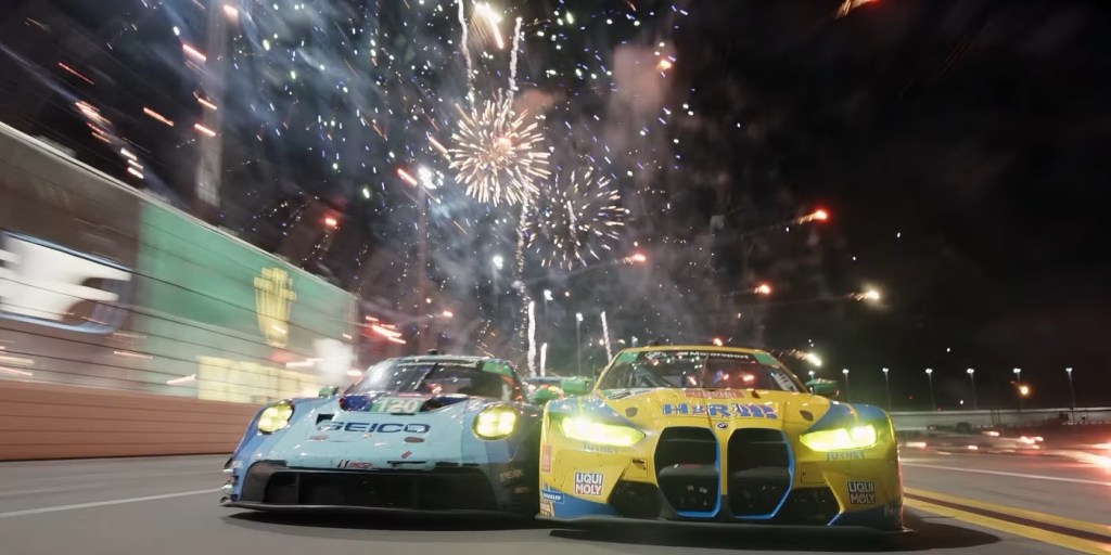 There are so many different shots to highlight throughout this film. Overall it is insane how the film uses broad shots, close ups, inverted, and POV shots to accomplish the feeling of you being on the race track with them and also at times being a spectator at the race. This really helps immerse us viewers in the experience of the races and feel connected to the results and characters. The opening race really sets us up as we get close up battling in the race, then an arial long range shot of the fireworks going off as the cars raced by. Big time summer blockbuster vibes off the rip with this shot. There are a lot of other fun shots but I’m going to focus on the race elements since those were the most impressive and if I say all I want about the cinematography this section will be 100,000 words.